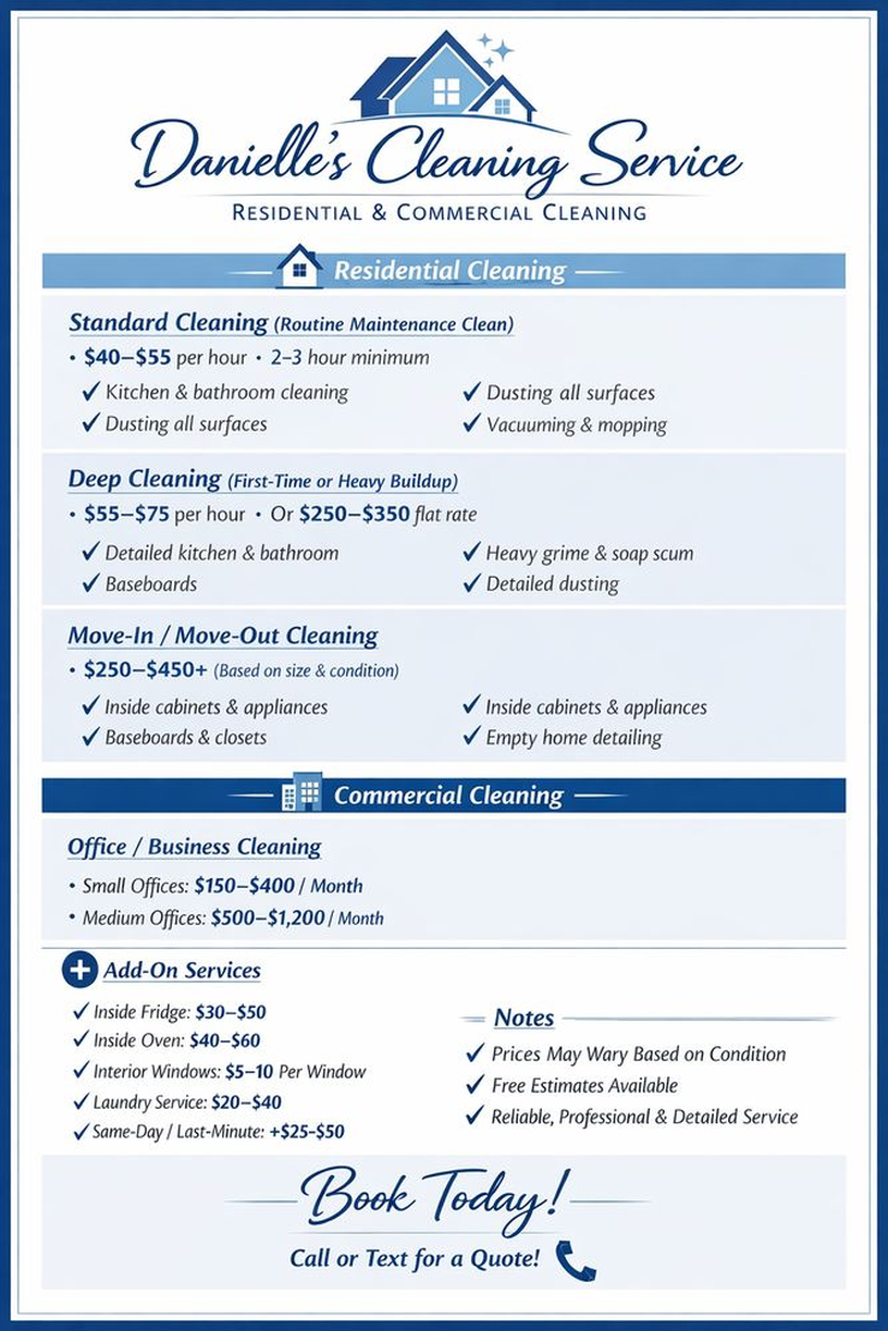 A full range of residential and commercial solutions is available, including thorough move-in cleaning, move-out cleaning, and reliable janitorial services. We also provide sanitization cleaning, window cleaning, and floor cleaning to maintain a clean, polished, and healthy environment, with carpet cleaning services coming soon. Every service starts with a free estimate, and we proudly offer 10% off for seniors, military members, and veterans. Convenient Square payments make the process simple and secure. Contact us today to schedule your service, request your free estimate, or learn how Danielle's Premier Cleaning can keep your space spotless.